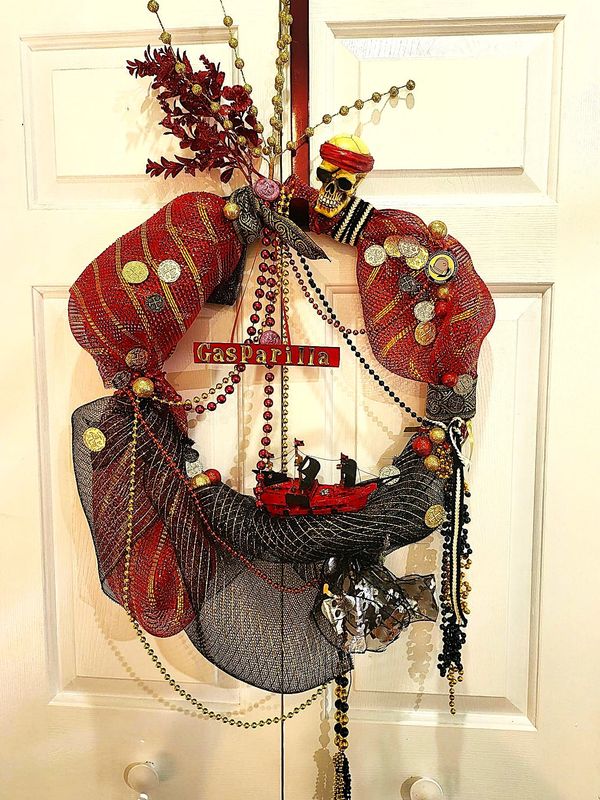 Wreaths are one of the most popular Gasparilla decorations. This wreath was homemade by Michelle Anderson after watching a few how-to videos. You can also buy wreaths online but expect to pay around $300!